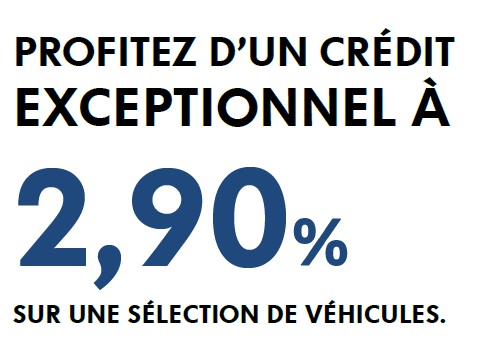 Crédit Auto véhicules d’occasion au T.A.E.G. fixe de 2.90 %* sur 36 mois avec un apport minimum de 10 % du prix total TTC du véhicule. Exemple pour un véhicule vendu 10 000 € : apport de 1 000 € et 9 000 € empruntés sur 36 mois : mensualités de 261,17 €. Montant total dû : 9 402,12 €.